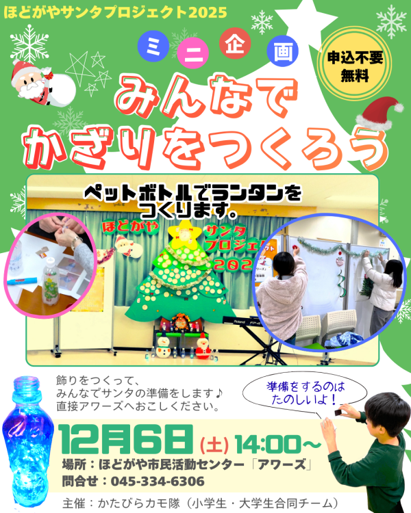 サンタプロジェクト当日の会場にかざる、LEDランプがピカピカ光るペットボトルランタンをつくったりします。カモ隊のみんなと一緒に相談しながらかざりつけをつくりましょう!