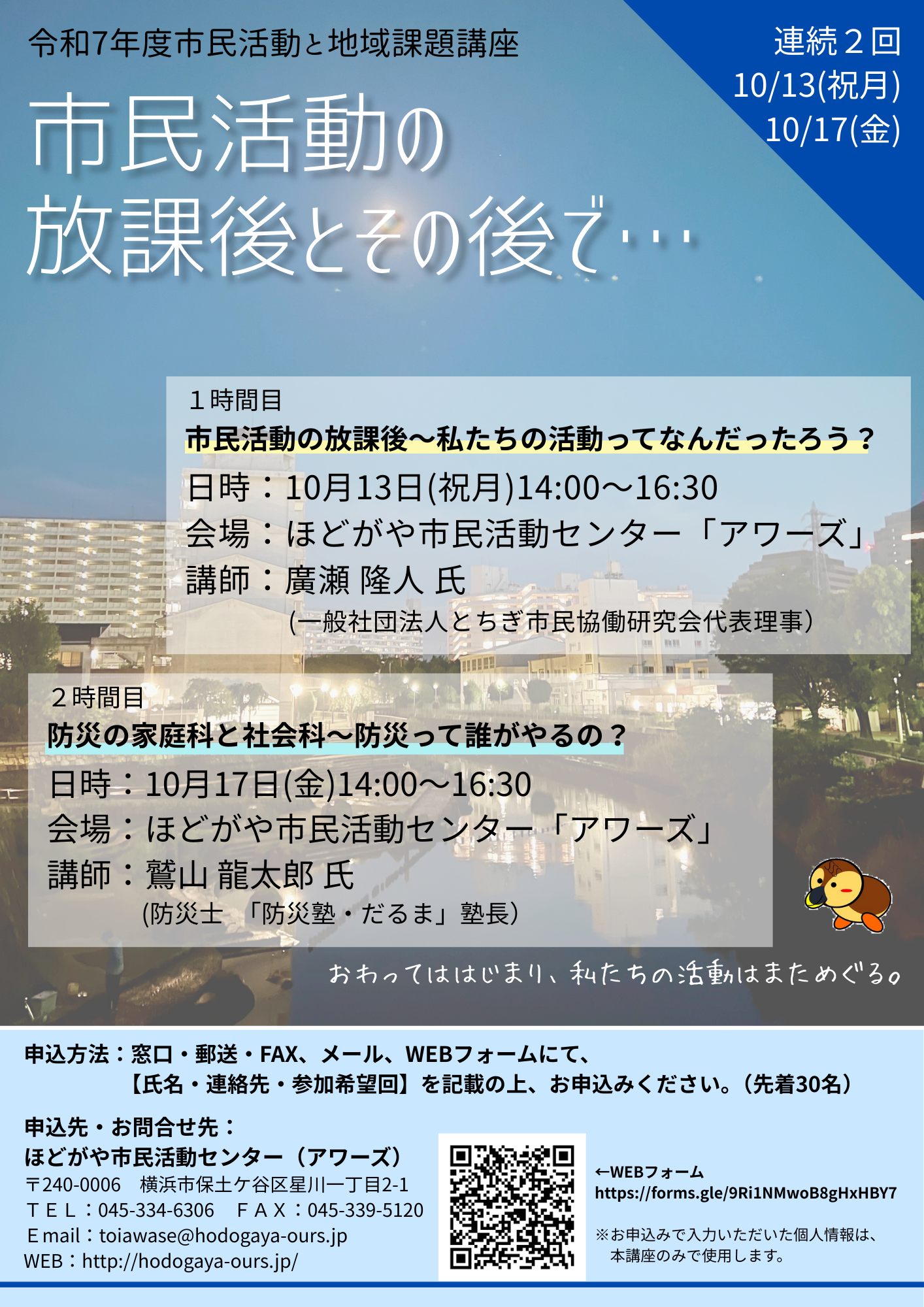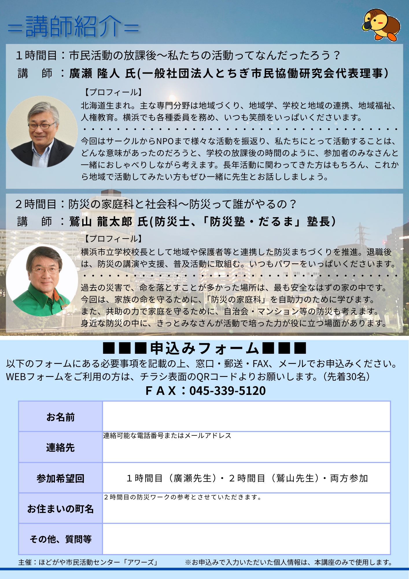 今回はサークルからNPOまで様々な活動を振返り、私たちにとって活動することは、どんな意味があったのだろうと、学校の放課後の時間のように、参加者のみなさんと一緒におしゃべりしながら考えます。長年活動に関わってきた方はもちろん、これから地域で活動してみたい方もぜひ一緒に先生とお話ししましょう。