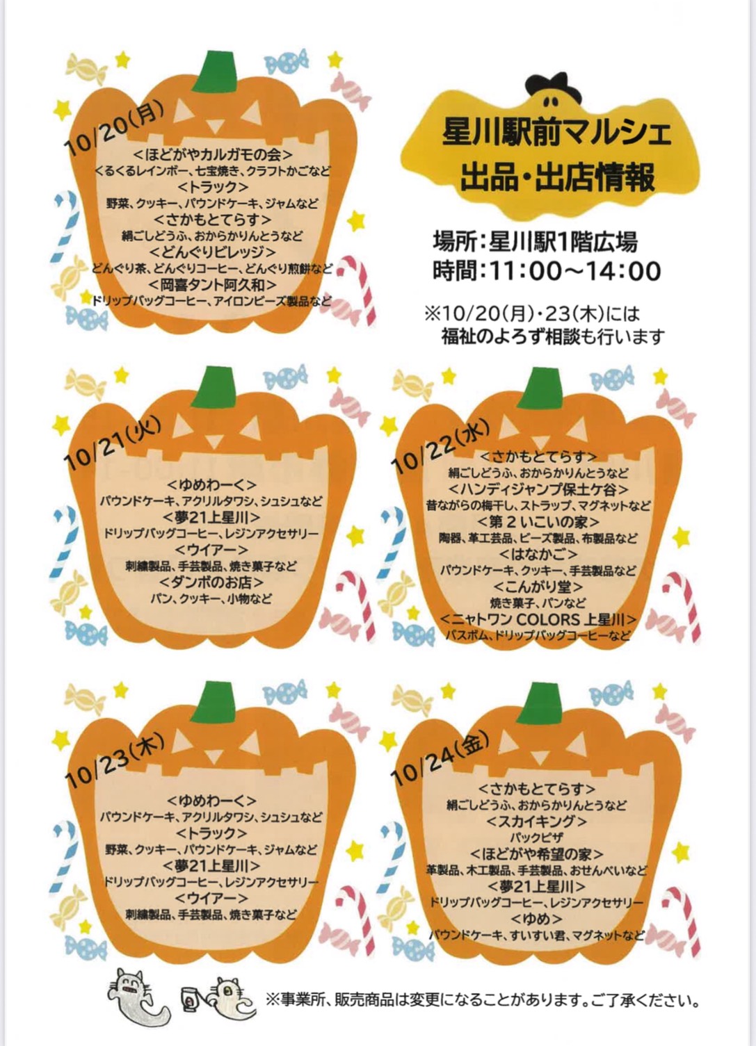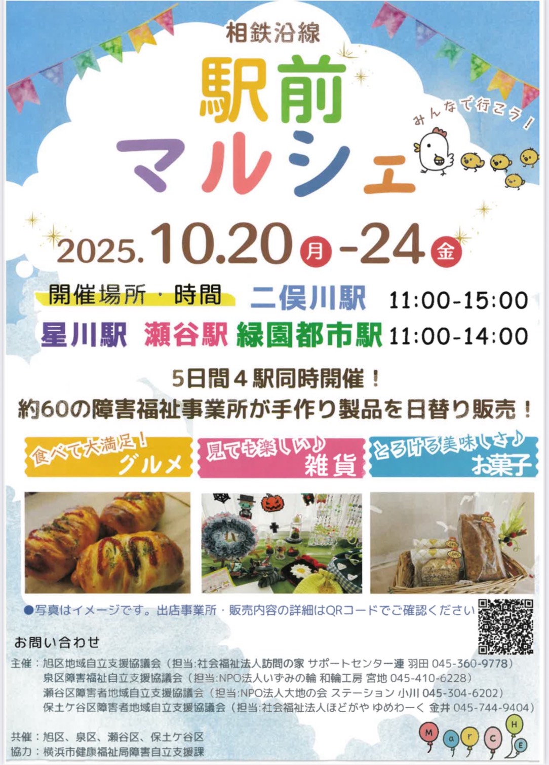 相鉄沿線 駅前マルシェ 受付中 開催日:2025.10.24 ~約60の障害福祉事業所が手作り製品を日替わり販売!~ 日時:10月20日(月)~24日(金) 11:00~14:00 会場:星川駅 ※その他 二俣川駅・瀬谷駅・緑園都市駅 二俣川駅は(15:00まで) 主催:保土ケ谷区障害者地域自立支援協議会 他 詳細:横浜市HP 資料・チラシなど 駅前マルシェ表 駅前マルシェ裏 一覧へ 学ぶ・体験 探す・見つける ボランティアする 活動グループをつくる ボランティアを呼ぶ 使う・借りる アワーズとは ほどガヤ防災塾 評議会議事録 施設の利用方法 各部屋・設備 予約申込について お知らせ 講座・イベントについて 講座・イベント一覧 登録団体・学習応援隊について 活動団体を探す 活動団体に登録する 学習応援隊を探す 学習応援隊に登録する アクセス・お問合せ メールマガジン 情報紙OURS LINK集 保土ケ谷区役所