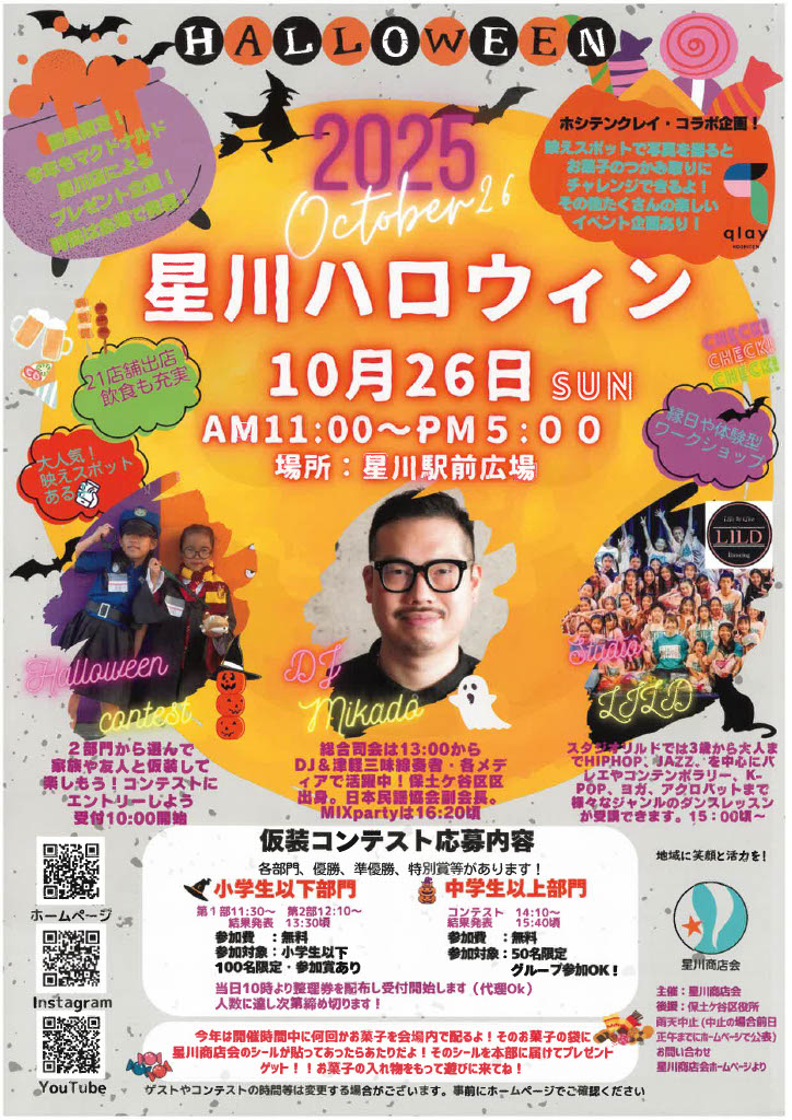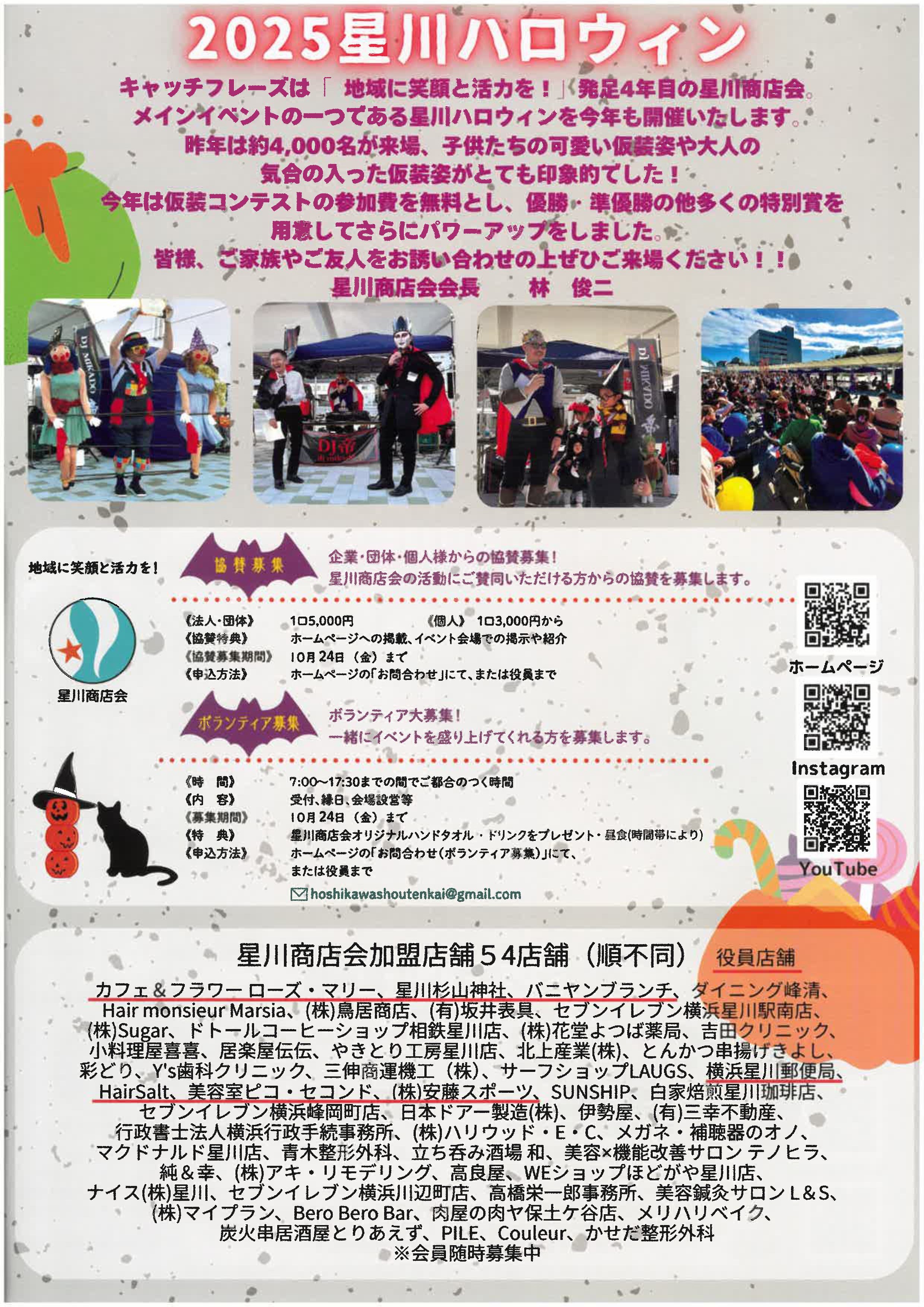 2025星川ハロウィン 受付中 開催日:2025.10.26 ~地域に笑顔と活力を!~ 星川ハロウィンを今年も開催いたします 21店舗出店、仮装コンテスト、縁日や体験型ワークショップなど 日時 10月26日(日)11:00~17:00 場所 星川駅前広場 ※仮装コンテスト 小学生以下部門・中学生以上部門 いずれも参加費無料、当日10時より整理券配布し受付 詳細はチラシ参照 資料・チラシなど 2025星川ハロウィンチラシ 表 2025星川ハロウィンチラシ 裏 一覧へ 学ぶ・体験 探す・見つける ボランティアする 活動グループをつくる ボランティアを呼ぶ 使う・借りる アワーズとは ほどガヤ防災塾 評議会議事録 施設の利用方法 各部屋・設備 予約申込について お知らせ 講座・イベントについて 講座・イベント一覧 登録団体・学習応援隊について 活動団体を探す 活動団体に登録する 学習応援隊を探す 学習応援隊に登録する アクセス・お問合せ メールマガジン 情報紙OURS LINK集 保土ケ谷区役所