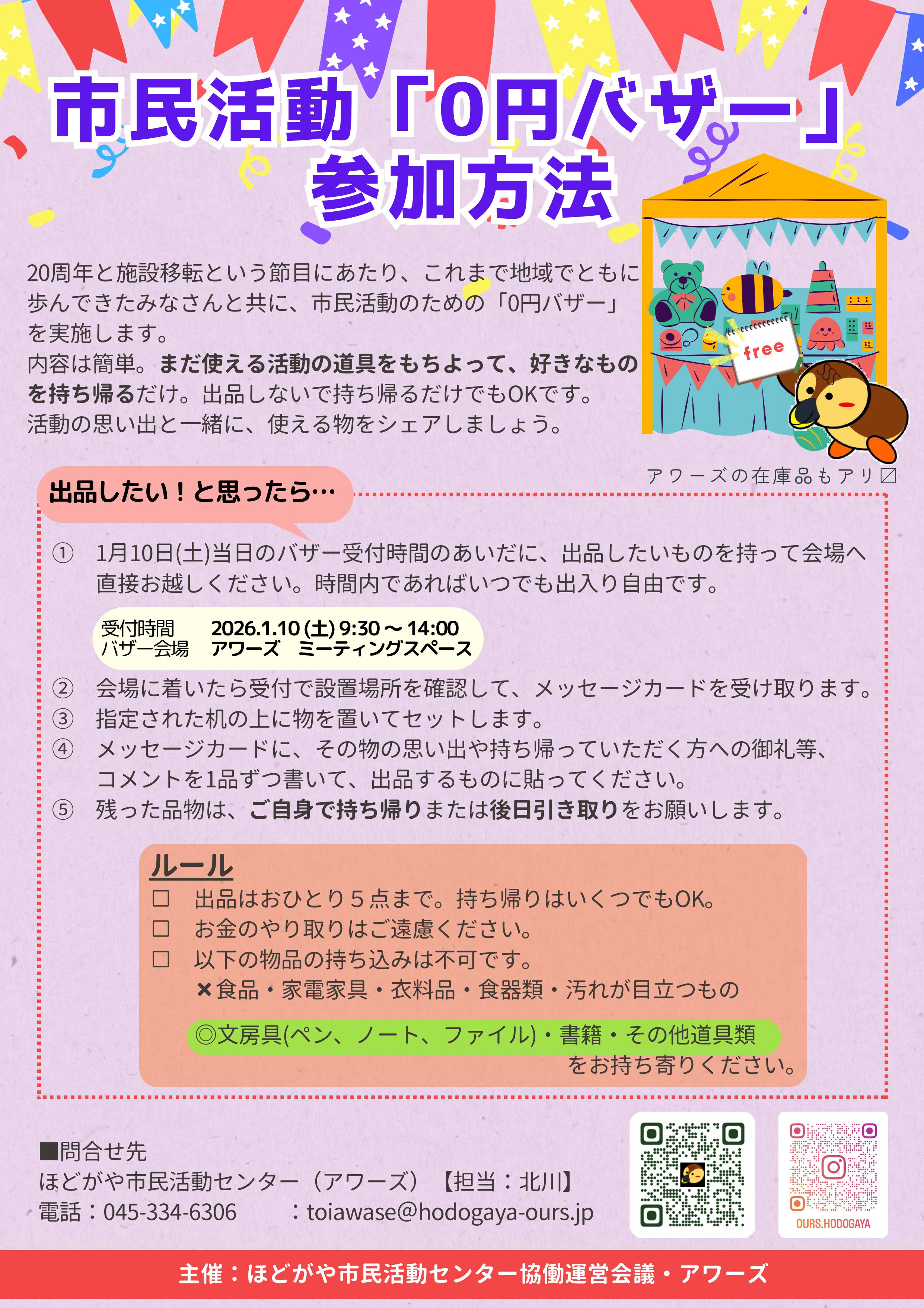 これまで地域でともに歩んできたみなさんと共に、市民活動のための「0円バザー」を実施します。まだ使える活動の道具をもちよって、好きなものを持ち帰るだけ。出品しないで持ち帰るだけでもOKです。活動の思い出と一緒に、使える物をシェアしましょう。(アワーズの在庫品もアリ〼)