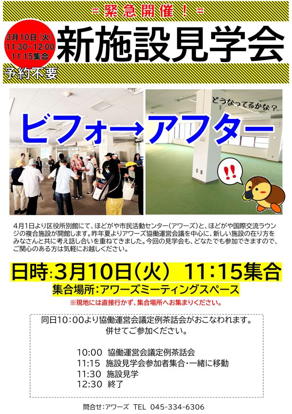 ほどがや市民活動センター「アワーズ」は、令和8年4月に保土ケ谷区役所別館へ移転(ほどがや国際交流ラウンジとの複合化)することになりました。現時点の内容については、下記保土ケ谷区役所作成の「ほどがや市民活動センター・ほどがや国際交流ラウンジの移転について(令和7年3月18日)」をご確認ください。今後の詳細はまた決まり次第お知らせさせていただきます。アワーズをご利用のみなさまには、ご不便をおかけしますが、何卒ご理解ご協力をお願い申し上げます。※移転に伴う休館期間(未定)までは現施設の運営を継続します。